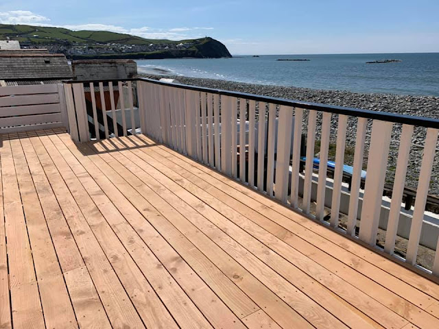 Treated decking on a 50% slope that had very little use previously. Now an approx 10M2 deck with loads of useable space and a sea view